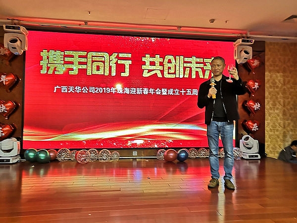 時至歲末年初,這座“百島之市”、“浪漫之城”仍然如初秋般清爽晴和。1月2日傍晚5時,前來參加活動的公司員工、家屬及嘉賓們陸續(xù)匯聚慶典會場,李驊所長作了簡明扼要的活動致辭之后,廣西天華公司2019年迎新春年會暨十五周年慶典在一片歡樂祥和的氣氛中開始了。